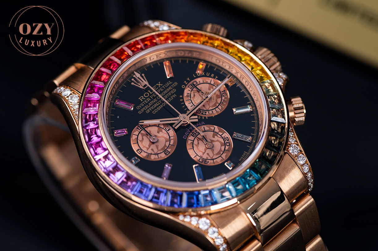 Nếu đã quá quen với những phiên bản đồng hồ thể thao, hiện đại thì với Rolex Cosmograph Daytona Everose Gold Rainbow, chúng ta sẽ được chiêm ngưỡng 1 ngoại hình mới lạ và hấp dẫn hơn nhiều. Và cũng chính sự khác biệt đó đã khiến cho chiếc đồng hồ Rolex này trở thành tâm điểm của mọi sự chú ý.