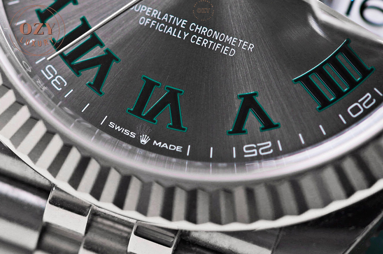 Rolex Datejust Rolesor White Gold Slate Green Roman Dial dễ dàng khiến các quý ông “ngã gục” với màn thôi miên đầy ảo diệu của mình. Sản phẩm sở hữu một vẻ đẹp mang tính chuẩn mực nhưng cũng rất độc lạ và hấp dẫn. Tất cả vẻ đẹp đó được thể hiện rõ ràng nhất ở mặt số. Mặt số chải tia Sundest màu xám bạc độc đáo, rất trầm và nam tính. Gam màu này đúng chuẩn gu yêu thích của các quý ông sành sỏi. Đặc biệt nhất trên mặt số chính là các cọc số la mã. Khác hoàn toàn với những siêu phẩm khác, cọc số của Rolex Datejust Rolesor White Gold Slate Green Roman Dial được phủ đá phiến màu xanh lá cây. Đây là chất liệu khá mới được Rolex ứng dụng vào các tác phẩm độc quyền của mình. Hơn nữa, gam màu xanh lá còn toát lên một sự thu hút rất kỳ diệu. Nó khiến cho chúng ta muốn dừng lại ở đó và ngắm nhìn thật lâu.